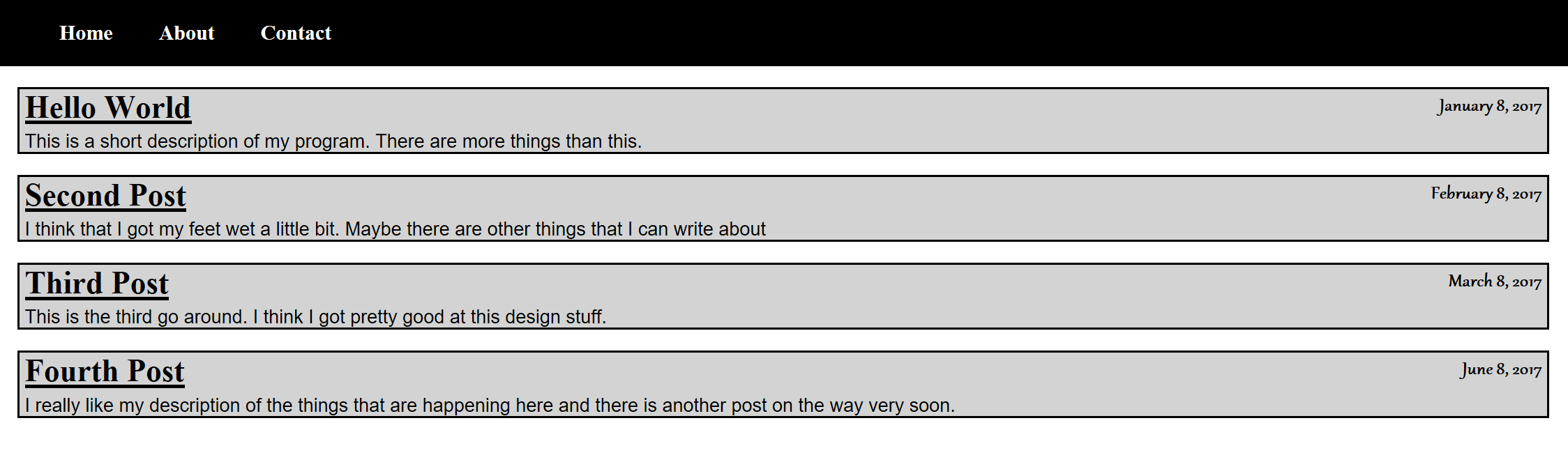html>(head>title+link)+(body>(nav>ul>li.nav-item*3)+(div>div.article>h2.article-title+h6.article-date+p.article-description)*4